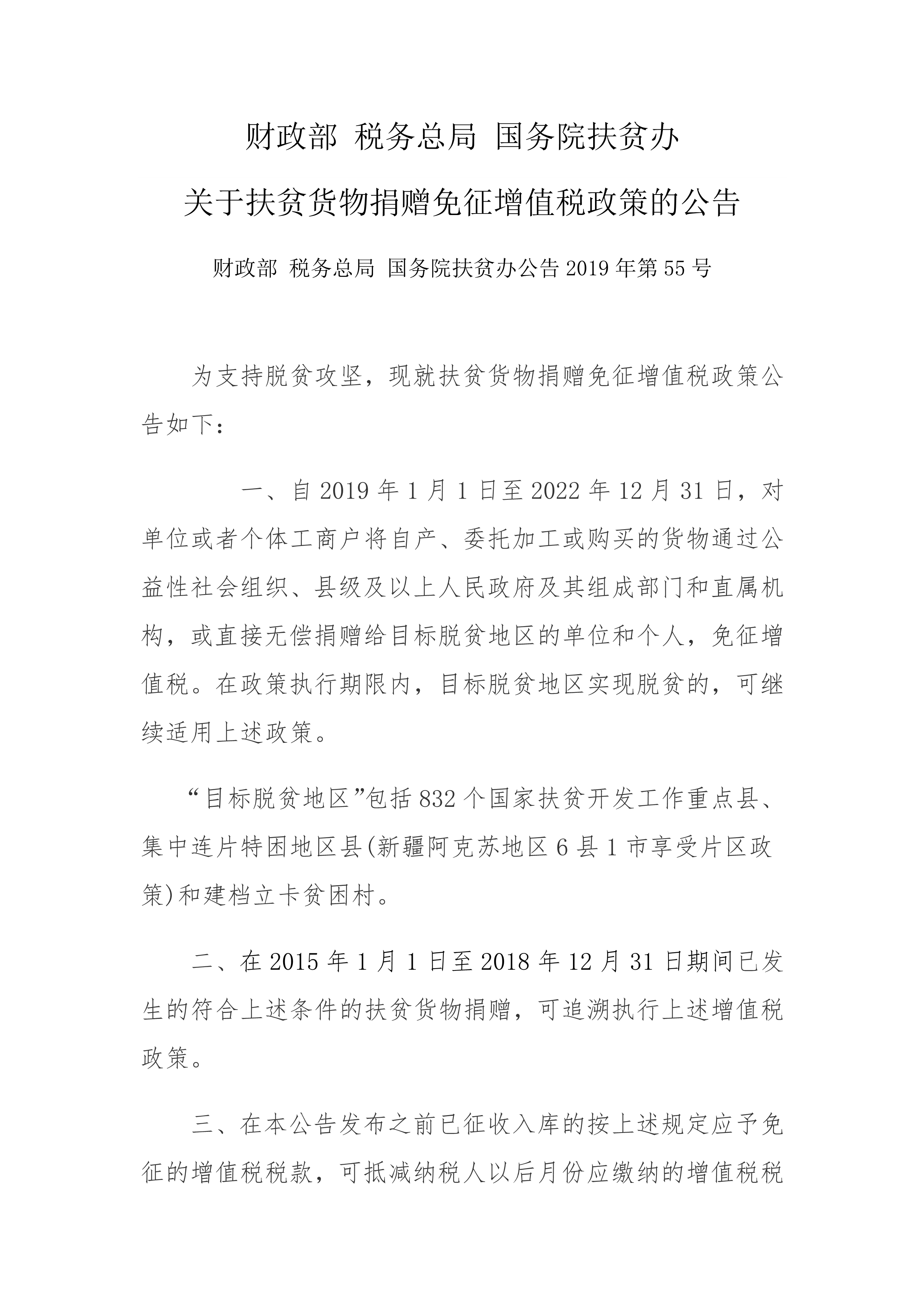 關(guān)于扶貧貨物捐贈(zèng)免征增值稅政策的公告
